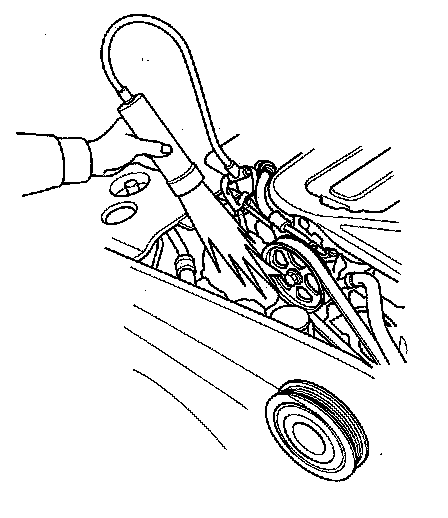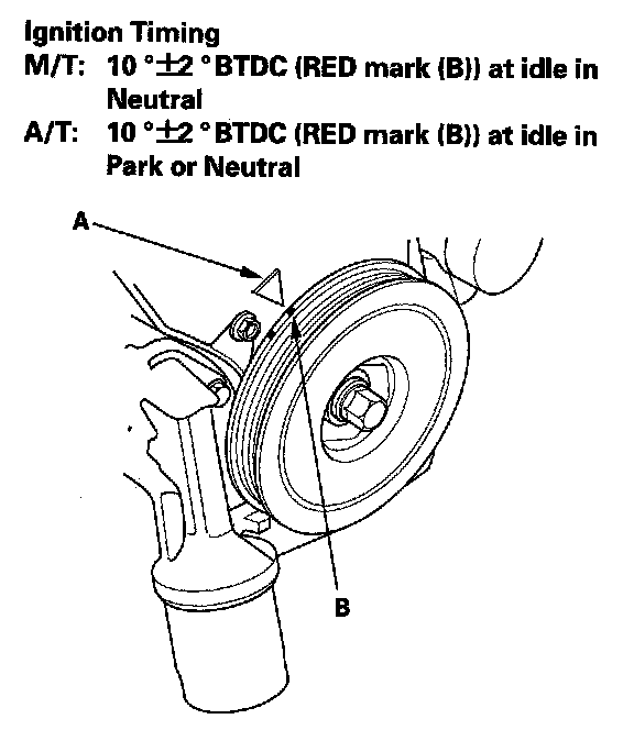 9. Aim the light toward the pointer (A) on the timing belt cover. Check the ignition timing under a no load condition, (headlights, blower fan, rear window defogger, and air conditioner are turned off).