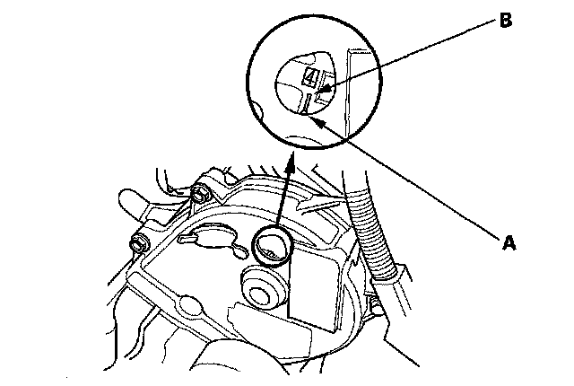 8. Rotate the crankshaft clockwise. Align the pointer (A) on the front upper cover with the No. 4 piston TDC mark (B) on the front camshaft pulley.