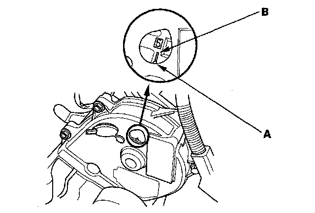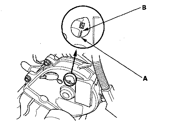 3. Set the No. 1 piston at top dead center (TDC). Align the pointer (A) on the front upper cover with the No. 1 piston TDC mark (B) on the front camshaft pulley.