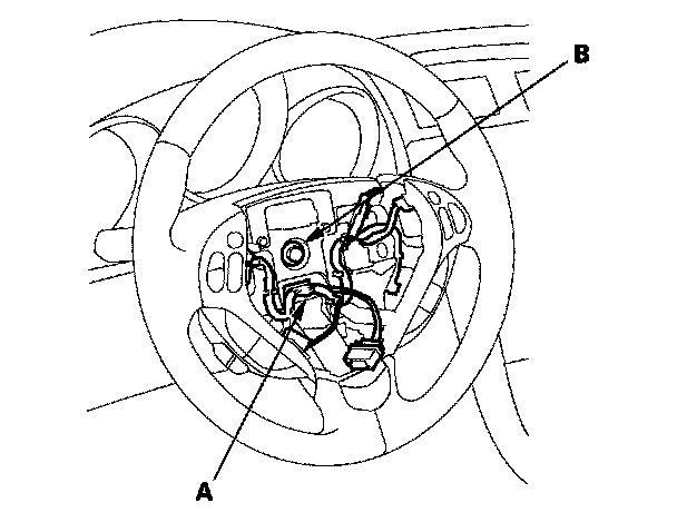 4. Disconnect the connector (A) from the cable reel, then remove the steering wheel bolt (B).