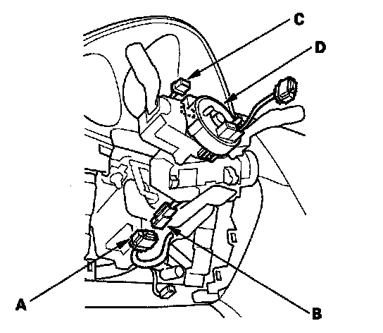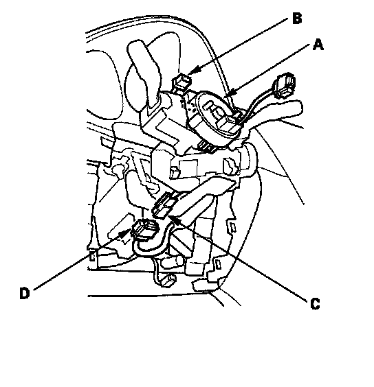9. Disconnect the dashboard wire harness 4P connector (A) from the cable reel 4P connector (B), then disconnect the dashboard wire harness 13P connector (C) from the cable reel (D).