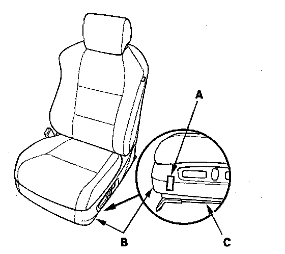 7. Using a piece of tape (A), mark the location on the seat's outer cover (B) where the front riser cover meets the seat riser (C). The driver's seat position sensor should read "NEAR".
