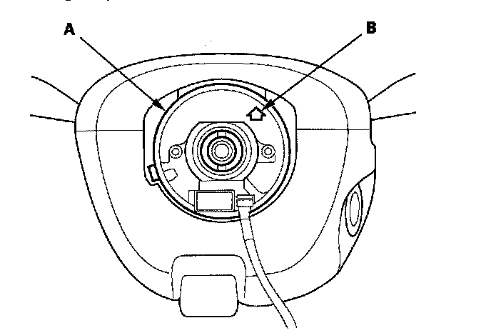 Steering Wheel Installation1. Before installing the steering wheel, make sure the front wheels are aligned straight ahead, then center the cable reel (A). Do this by first rotating the cable reel clockwise until it stops. Then rotate it counterclockwise about three full turns. The arrow mark (B) on the cable reel label point should point straight up.