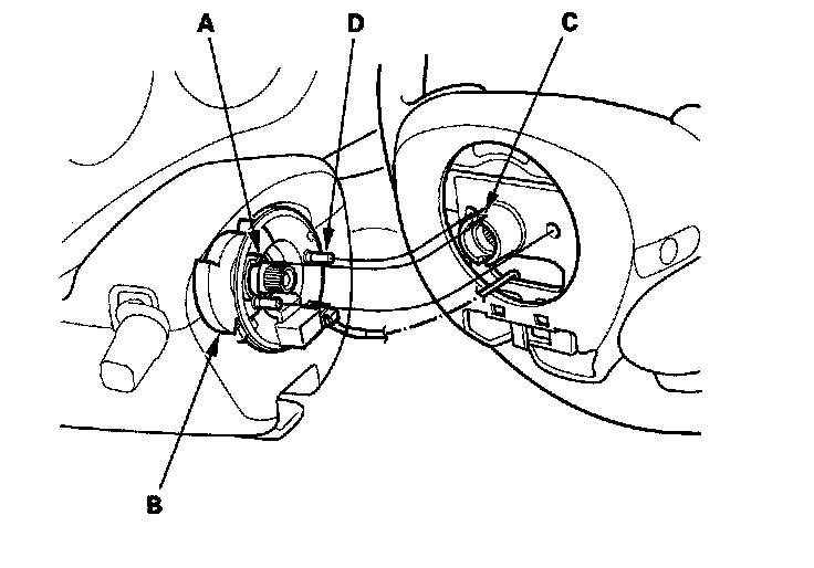 2. Position the two tabs (A) of the turn signal canceling sleeve (B) as shown. Install the steering wheel on to the steering column shaft, making sure the steering wheel hub (C) engages the pins (D) of the cable reel and tabs of the turn signal canceling sleeve. Do not tap on the steering wheel or steering column shaft when installing the steering wheel.