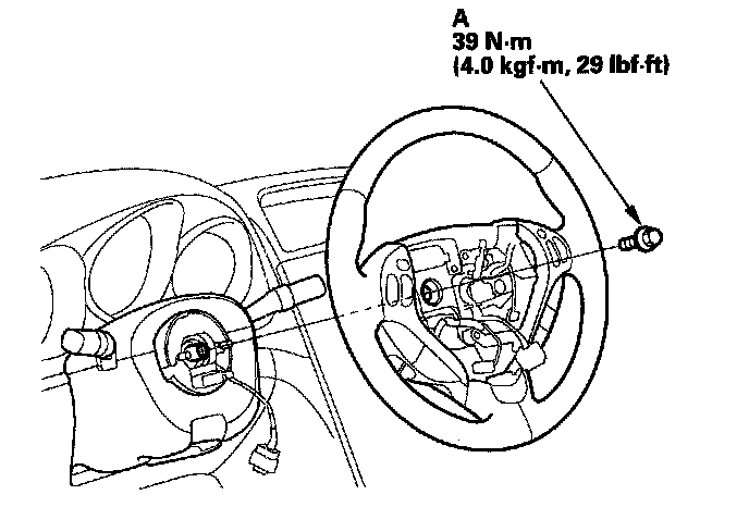 3. Install the steering wheel bolt (A) and tighten it to the specified torque Connect the cable reel subharness connector. Make sure the wire harness is routed and fastened properly.