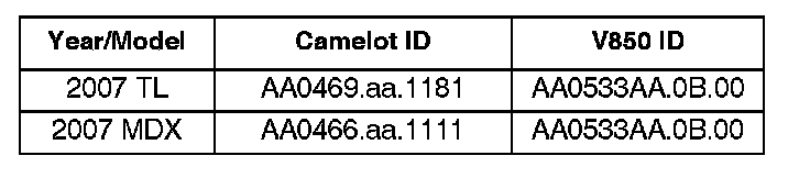 The updated AcuraLink sofiware program IDs are shown below. If both of the Camelot (main program) and V850 (subprogram) program IDs or later versions are the current IDs displayed (see DIAGNOSIS), the software for this bulletin is already installed in the AcuraLink control unit.