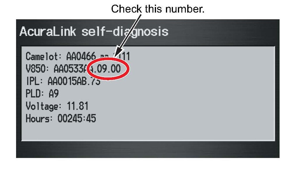 1. To determine if the AcuraLink control unit needs updating, check the current V850 software version in the AcuraLink control unit: