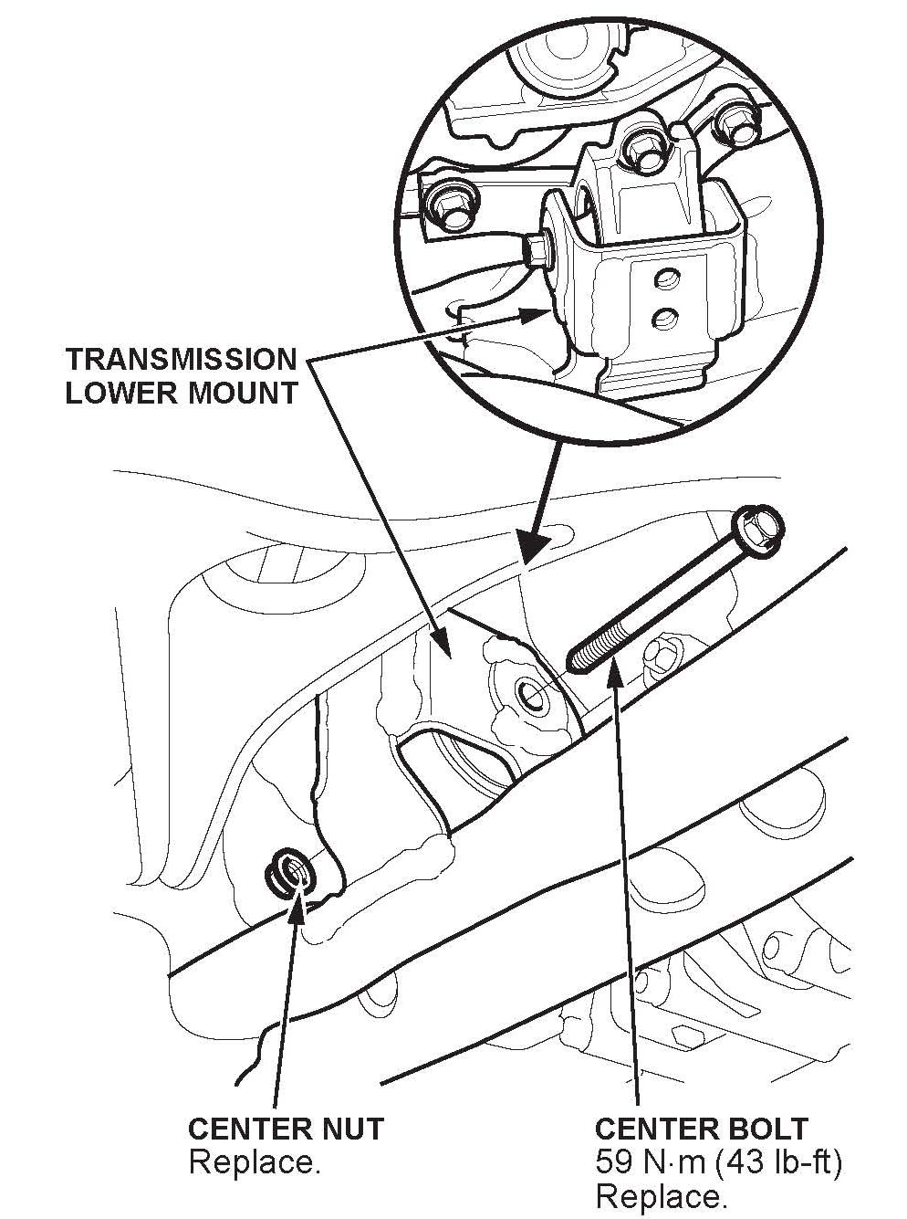 37. A/T models only: Install a new A/T lower mount center bolt and nut, and torque it to 59 N.m (43 lb-ft).
