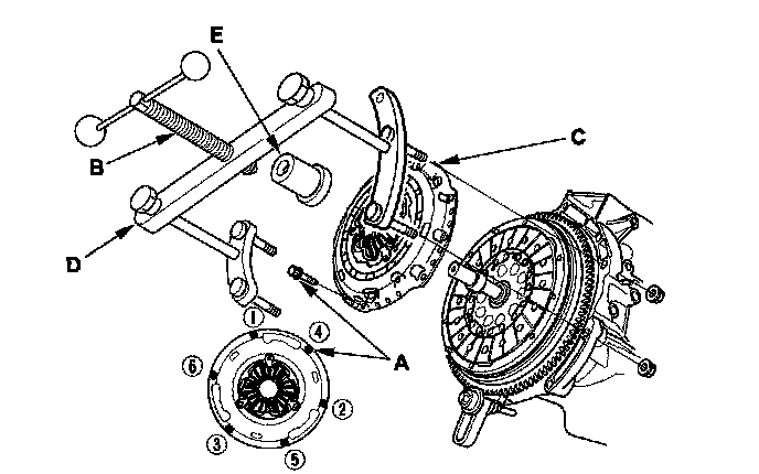 4. Loosen the pressure plate mounting bolts (A) in the pattern shown in several steps, then remove the bolts.
