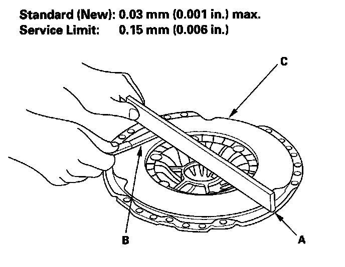 8. Inspect for warpage using a straight edge (A) and a feeler gauge (B). Measure across the pressure plate (C). If the warpage is more than the service limit, replace the pressure plate and clutch disc as a set.