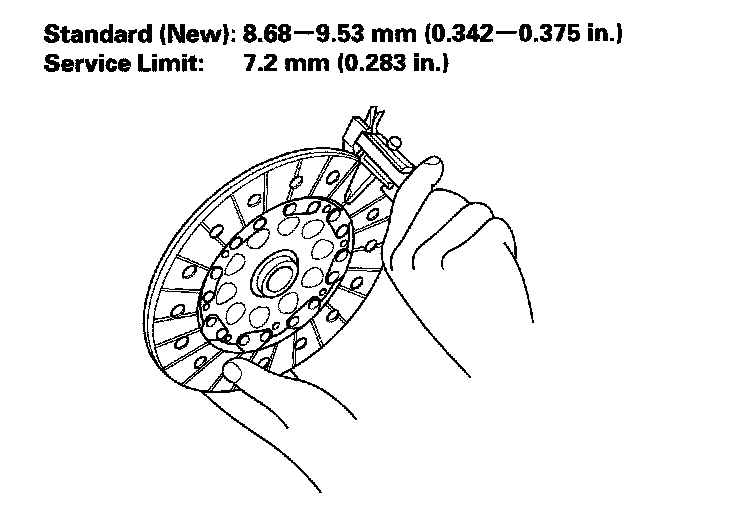11. Measure clutch disc thickness. If the thickness is less than the service limit, replace the clutch disc and pressure plate as a set.