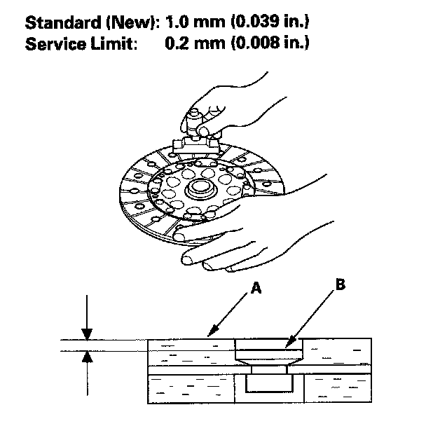 12. Measure rivet depth from the clutch disc lining surface (A) to the rivets (B) on both sides. If the rivet depth is less than the service limit, replace the clutch disc and pressure plate as a set.