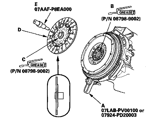 4. Apply super high temp urea grease (P/N 08798-9002) to the splines (C) of the clutch disc (D), then install the clutch disc using the clutch alignment shaft (E).