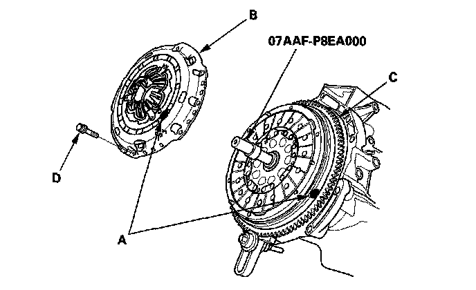 5. Align a point mark (A) across the pressure plate (B) and flywheel (C).