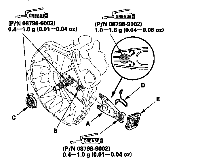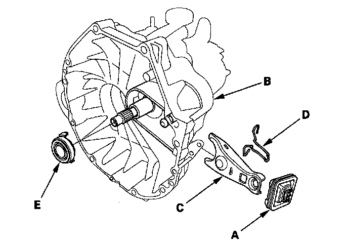 2. Remove the release fork (C) from the clutch housing by squeezing the release fork set spring (D). Remove the release bearing (E).