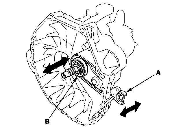 8. Move the release fork (A) right and left to make sure that it fits properly against the release bearing (B) and that the release bearing slides smoothly. Wipe off any excess grease.