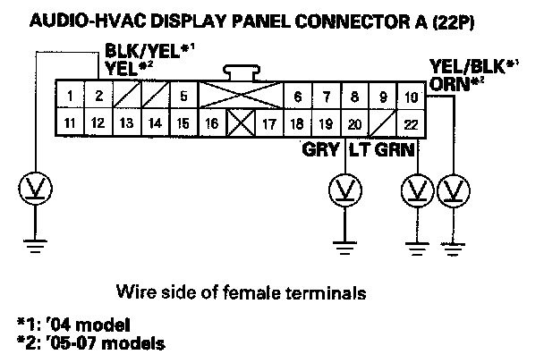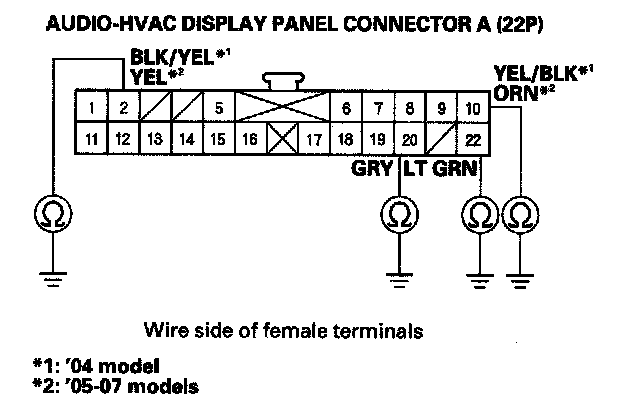 9. Check for continuity between body ground and audio-HVAC display panel connector A (22P) terminals No. 2, 10, 20, and 22 individually.