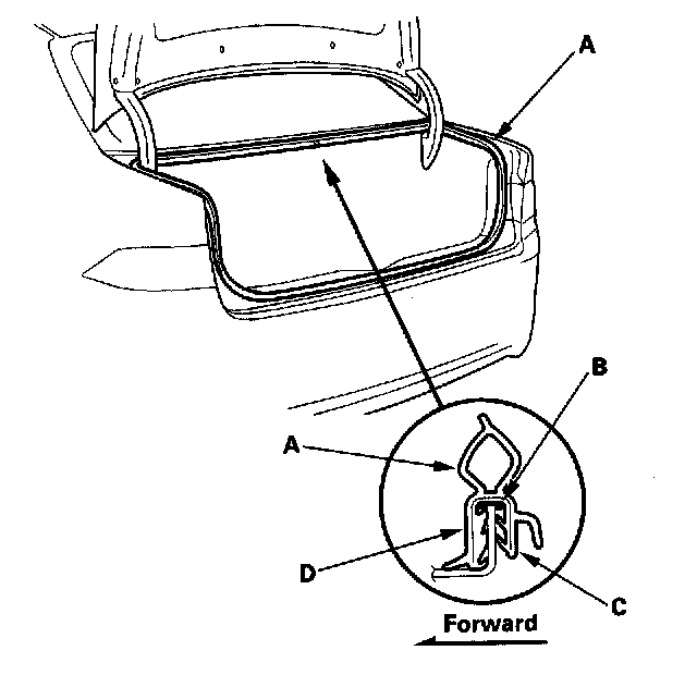 Trunk Lid Weatherstrip Replacement1. Remove the trunk lid weatherstrip (A) by pulling it off.