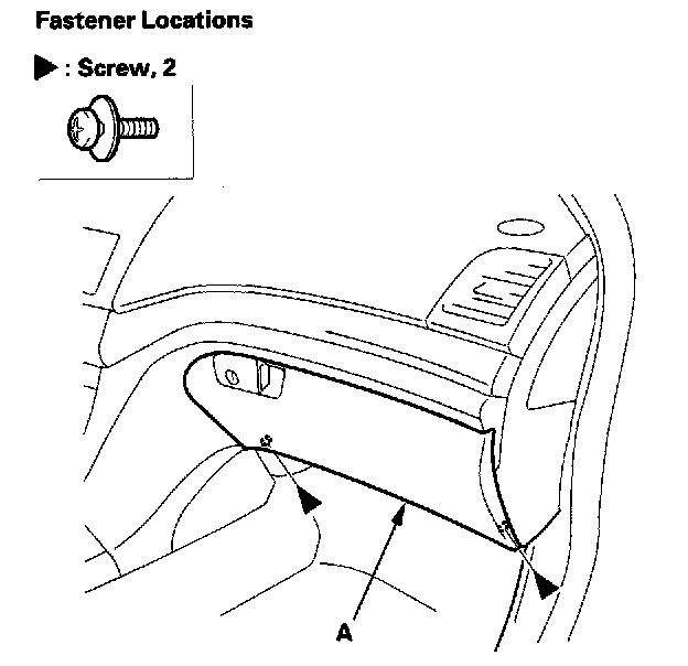 3. While holding the glove box (A), remove the screws, then remove the glove box.