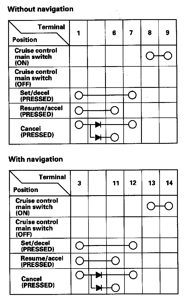 - If there is continuity, and it matches the table, but switch failure occurred on the cruise control unit input test, check and repair the wire harness on the switch circuit.