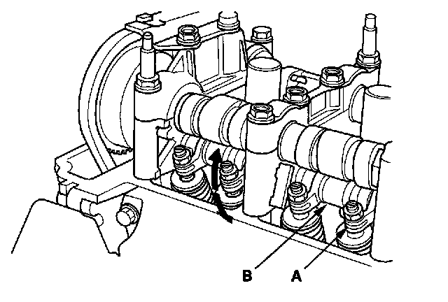 ^ If the mid and primary rocker arms do not move together with the secondary rocker arm, remove the mid, primary, and secondary rocker arms as an assembly, and check that the pistons in the rocker arms move smoothly. If any rocker arm needs replacing, replace the mid, primary, and secondary rocker arms as an assembly, and retest.