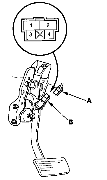 Brake Pedal Position Switch Test1. Disconnect the 4P connector (A) from the brake pedal position switch (B).