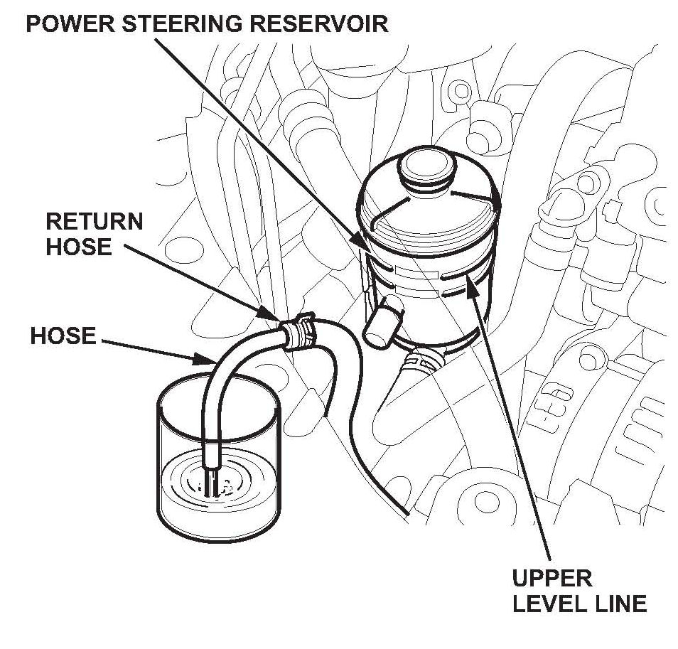 1. Raise the power steering reservoir, then disconnect the return hose, and drain the reservoir. Plug the return hose nipple with a suitable cap.
