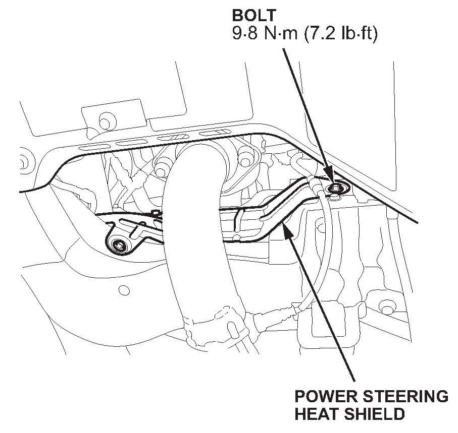 ^ Torque the feed hose/line holder mounting bolts and the power steering heat shield bolt to 9.8 N.m (7.2 lb-ft).