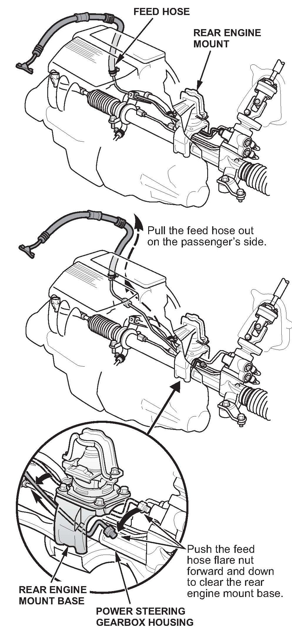 11. Disconnect the power steering feed hose from the gearbox by loosening its flare nut.