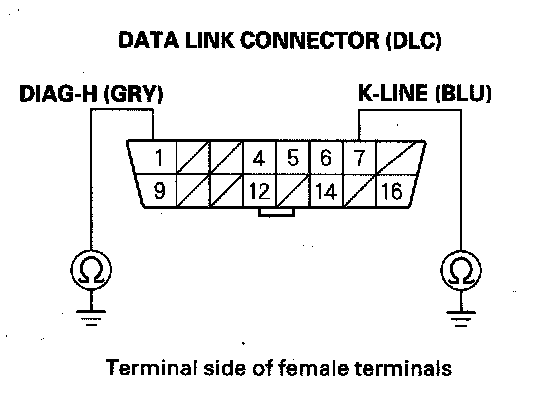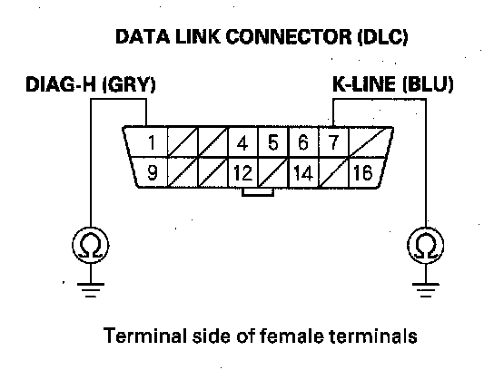 17. Check for continuity between body ground and DLC terminals No. 1 and No. 7 individually.
