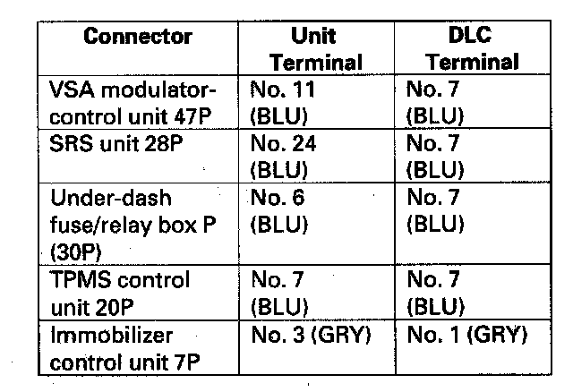 NO - Repair short in the wire between the DLC No. 7 (K-line) and the VSA modulator-control unit, the SRS unit, the TPMS control unit, or the underdash fuse/relay box (multiplex integrated control unit), or DLC No. 1 (DIAG-H line) and the immobilizer control unit.