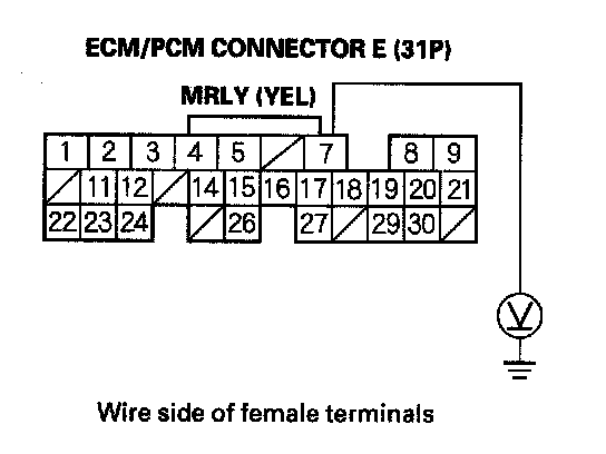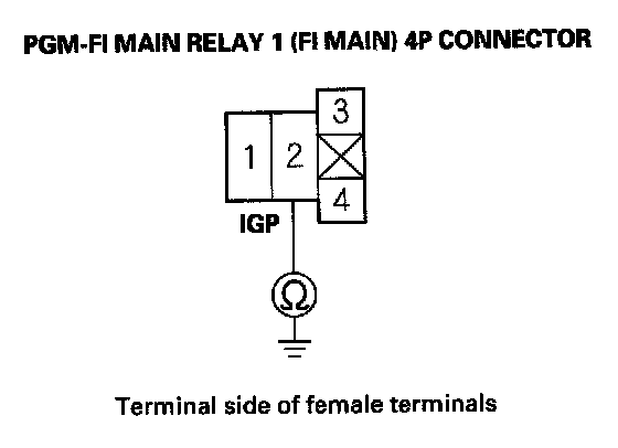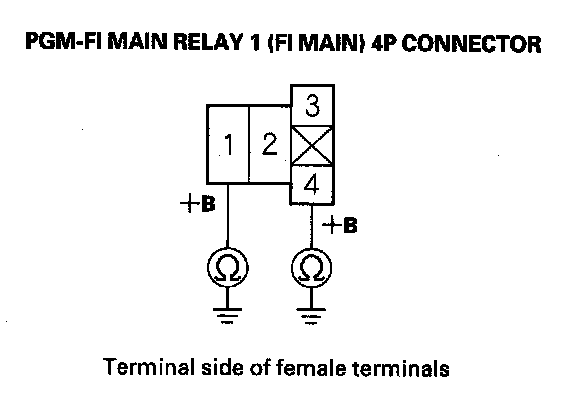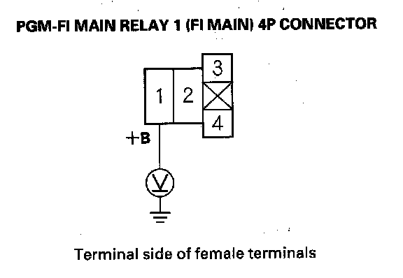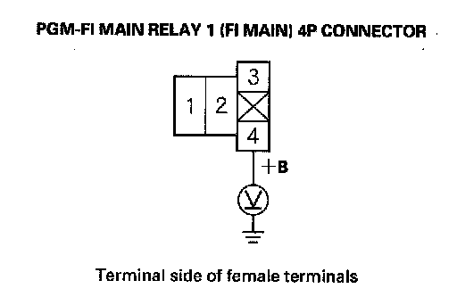 73. Measure voltage between PGM-FI main relay 1 (FI MAIN) 4P Connector terminal No. 1 and body ground.