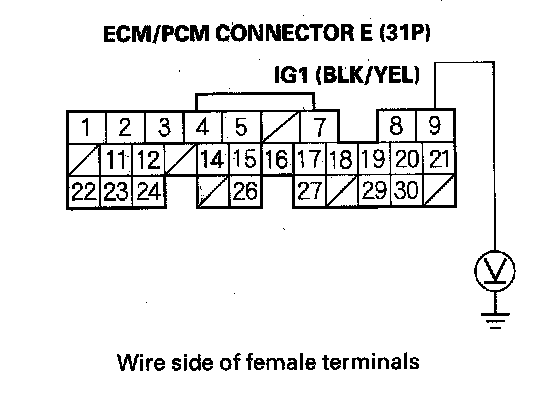 62. Measure voltage between ECM/PCM connector terminal E9 and body ground.