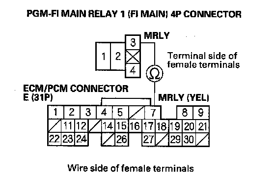 67. Check for continuity between PGM-FI main relay 1 (FI MAIN) 4P connector terminal No. 3 and ECM/PCM connector terminal E7.