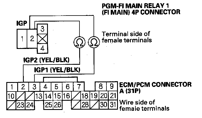 74. Check for continuity between PGM-FI main relay 1 (FI MAIN) 4P Connector terminal No. 2.and ECM/PCM connector terminals A2 and A3 individually.