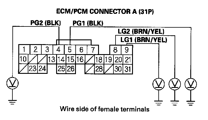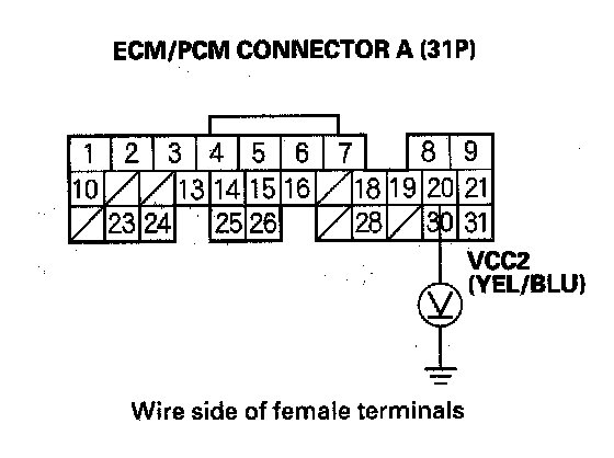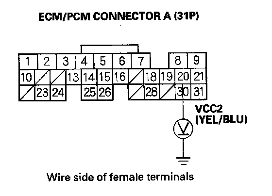 86. Disconnect the connector from each of these sensors, one at a time, and measure voltage between body ground and ECM/PCM connector terminal A20 with the ignition switch ON (II).