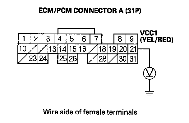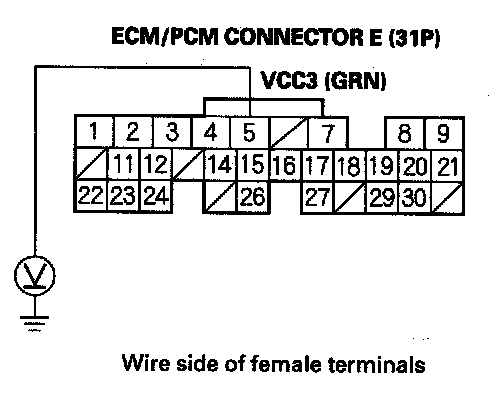 78. Disconnect the connector from each of these sensors, one at a time, and measure voltage between body ground and ECM/PCM connector terminal A21 with the ignition switch ON (II).