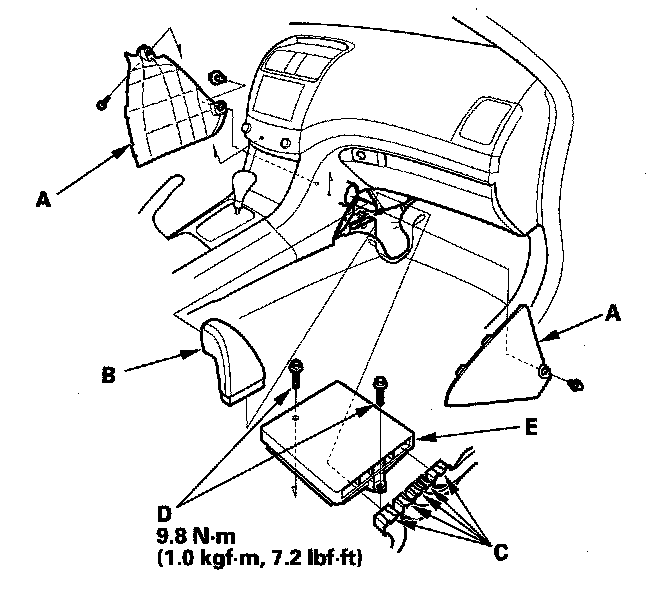 11. Remove the bolts (D), then remove the ECM/PCM (E).