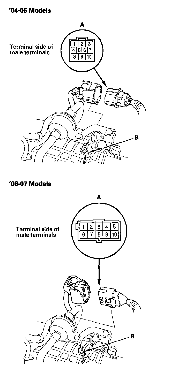 Transmission Range Switch Test1. Remove the transmission range switch harness connector (A) from the connector bracket (B), then disconnect the connector.