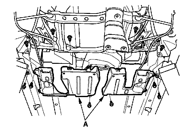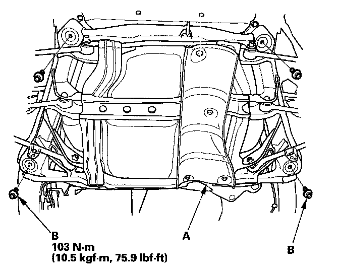 15. Remove the heat shield (A). Place a jack or support under the suspension subframe. Remove the mounting bolts (B). Remove the rear suspension subframe.