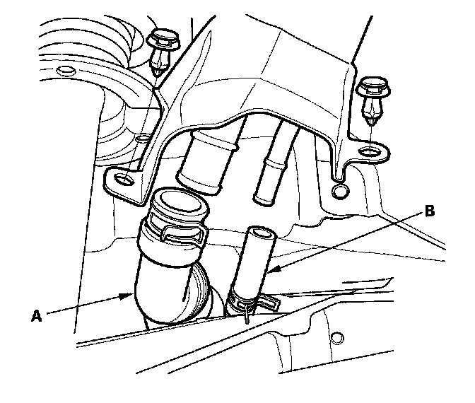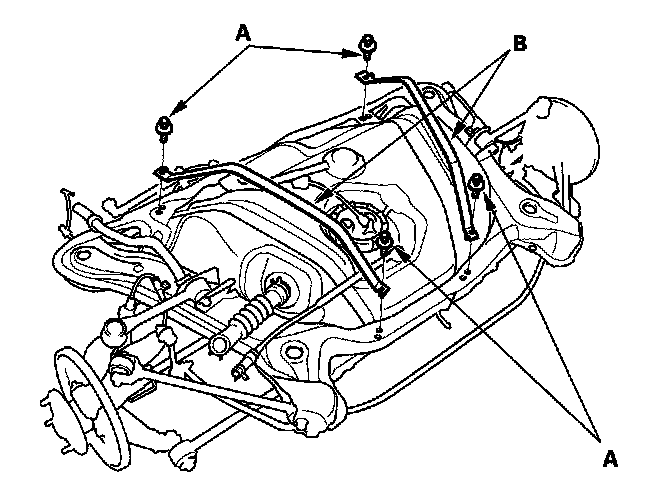 7. Disconnect the fuel fill neck tube (A) and breather hose (B).