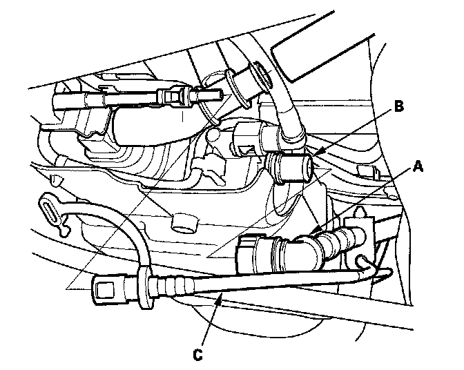 8. Disconnect the vapor line (A) from the EVAP canister (B). Then disconnect the fuel line (C).