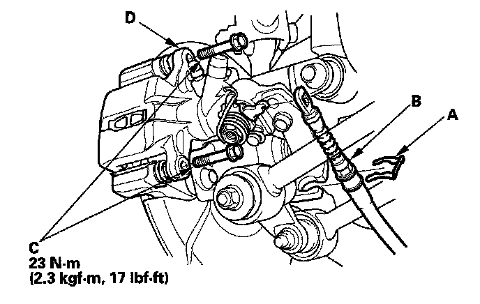 10. Remove the clip (A), parking brake cable (C), two caliper bolts (D), and caliper body (D).