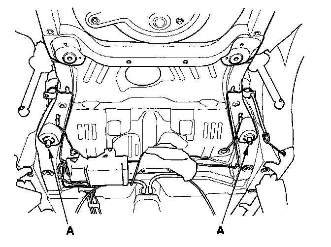 2. Place a jack or support under the rear suspension subframe. Install the rear suspension subframe, aligning the pins (A) with the holes in the subframe.