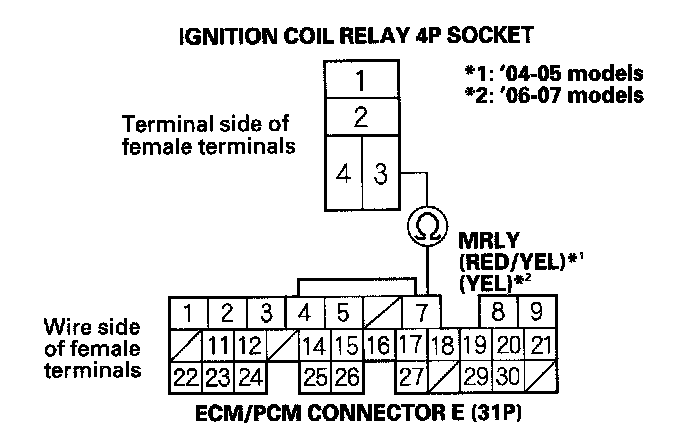 7. Check for continuity between ignition coil relay 4P socket terminal No. 3 and ECM/PCM connector terminal E7.