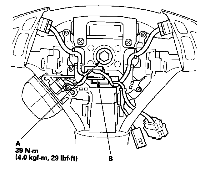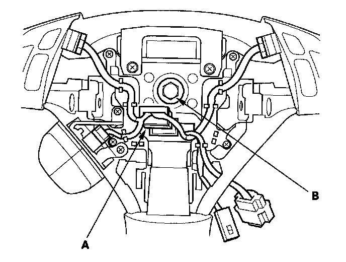4. Disconnect the connector (A) from the cable reel, then remove the steering wheel bolt (B).