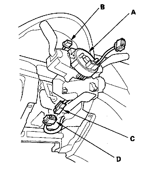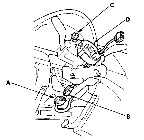 8. Disconnect the dashboard wire harness 4P connector (A) from the cable reel 4P connector (B), then disconnect the dashboard wire harness 13P connector (C) from the cable reel (D).