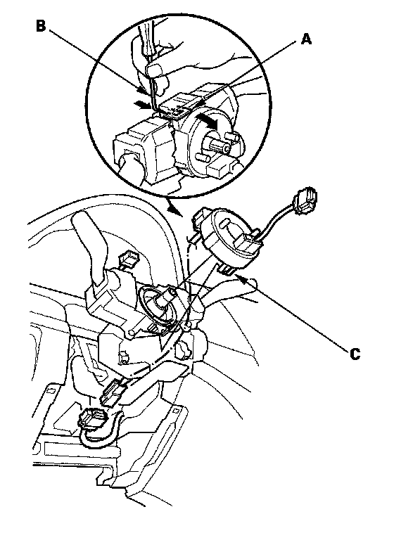 9. Release the lock tab (A) under the cable reel connector with a 90 ° hook shaped tool (B). Slide the tool below the cable reel connector just above the lock tab. Release the lower lock tab (C), and slide the cable reel off the column.