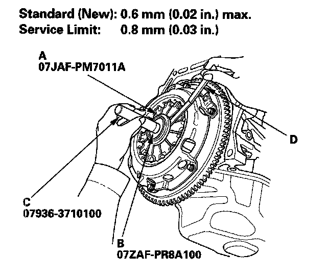 1. Check the height of the diaphragm spring fingers using the clutch alignment disc (A), clutch alignment shaft (B), remover handle (C), and a feeler gauge (D). If the height is more than the service limit, replace the pressure plate.
