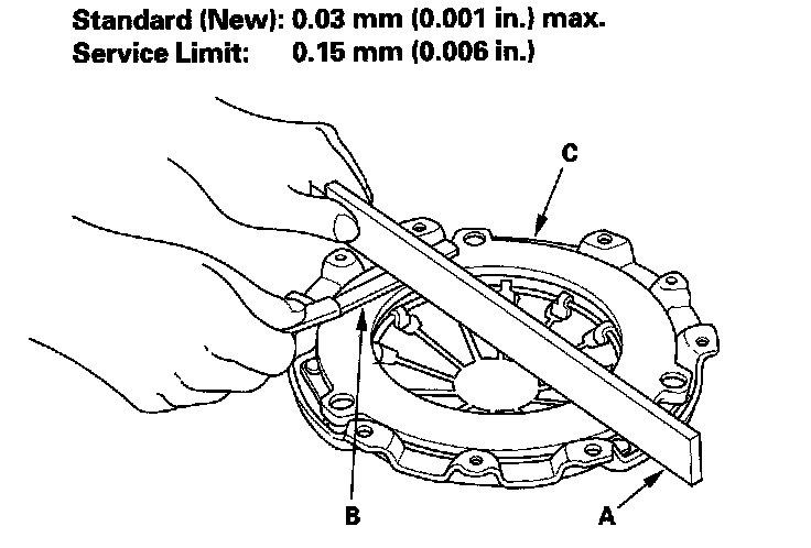 6. Inspect for warpage using a straight edge (A) and a feeler gauge (B). Measure across the pressure plate (C). If the warpage is more than the service limit, replace the pressure plate.
